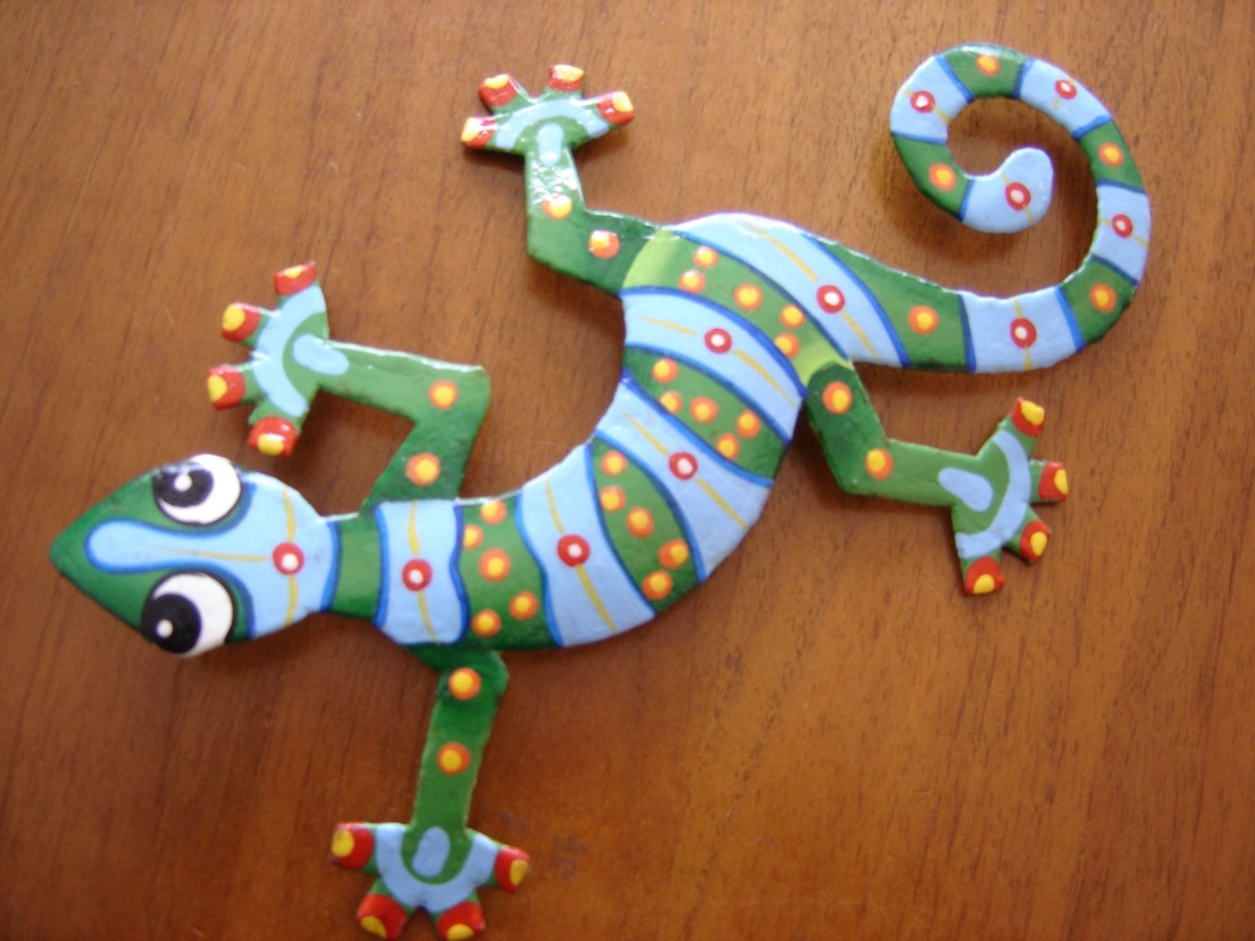 Bemale deinen Gecko, je nach Lust und Laune. Die Rohlinge stammen aus Haiti und werden aus alten Ölfässern gefertigt.